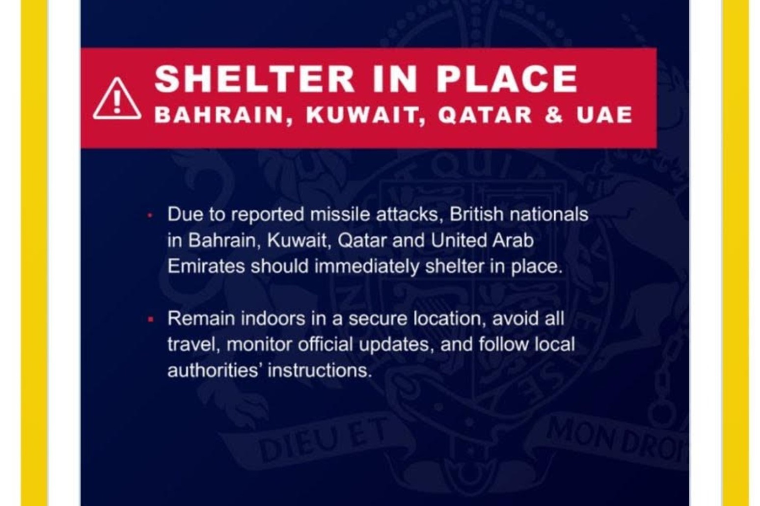 Foreign Office Warns Over Travel To Middle East As Airlines Cancel FlightsThe Foreign Office has updated its travel advice to warn against all travel to Israel and Palestine, and has urged British nationals in other Middle Eastern countries to “immediately shelter in place”..